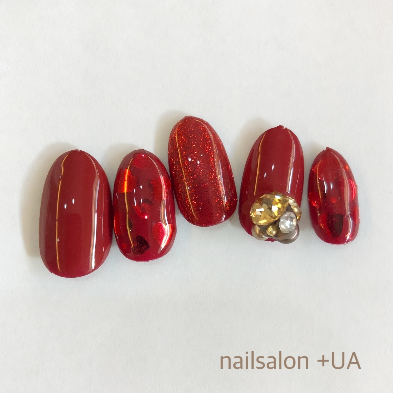 大人っぽいボルドーに、ホログラムのハートを敷き詰めた、攻めのバレンタインネイル。ゴールド系のスワロフスキーとの相性は抜群です。